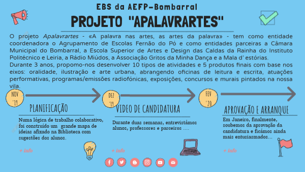O projeto Apalavrartes - «A palavra nas artes, as artes da palavra» - tem como entidade coordenadora o Agrupamento de Escolas Fernão do Pó e como entidades parceiras a Câmara Municipal do Bombarral, a Escola Superior de Artes e Design das Caldas da Rainha do Instituto Politécnico e Leiria, a Rádio Miúdos, a Associação Gritos da Minha Dança e a Mala d’ estórias.Durante 3 anos, propomo-nos desenvolver 10 tipos de atividades e 5 produtos finais com base nos eixos: oralidade, ilustração e arte urbana, abrangendo oficinas de leitura e escrita, atuações performativas, programas/emissões radiofónicas, exposições, concursos e murais pintados na nossa vila.
