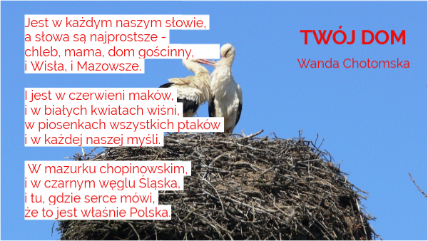 Jest w każdym naszym słowie, a słowa są najprostsze - chleb, mama, dom gościnny, i Wisła, i Mazowsze. I jest w czerwieni maków, i w białych kwiatach wiśni, w piosenkach wszystkich ptaków i w każdej naszej myśli. W mazurku chopinowskim, i w czarnym węglu Śląska, i tu, gdzie serce mówi, że to jest właśnie Polska.