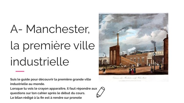 Suis le guide pour découvrir la première grande ville industrielle au monde.Lorsque tu vois le crayon apparaitre, il faut répondre aux questions sur ton cahier après le début du cours. Le bilan rédigé à la fin est à rendre sur pronote