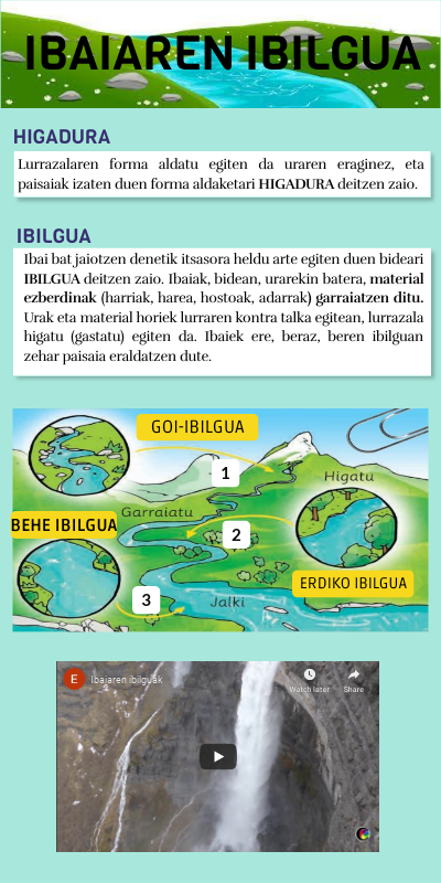 Ibai bat jaiotzen denetik itsasora heldu arte egiten duen bideari IBILGUA deitzen zaio. Ibaiak, bidean, urarekin batera, material ezberdinak (harriak, harea, hostoak, adarrak) garraiatzen ditu. Urak eta material horiek lurraren kontra talka egitean, lurrazala higatu (gastatu) egiten da. Ibaiek ere, beraz, beren ibilguan zehar paisaia eraldatzen dute.