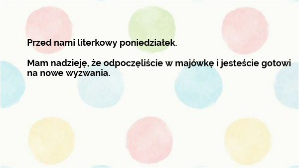 Przed nami literkowy poniedziałek. Mam nadzieję, że odpoczęliście w majówkę i jesteście gotowi na nowe wyzwania.