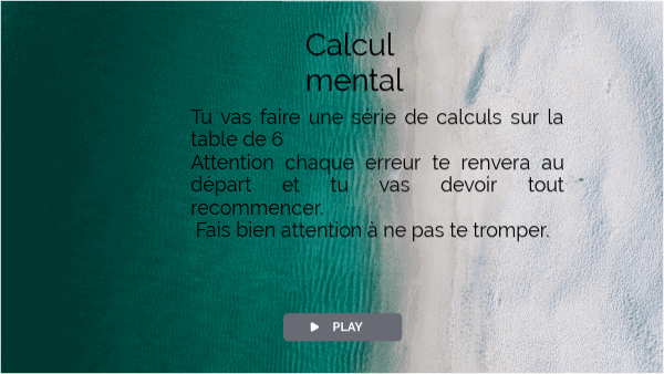 Tu vas faire une série de calculs sur la table de 6 Attention chaque erreur te renverra au départ et tu vas devoir tout recommencer. Fais bien attention à ne pas te tromper.
