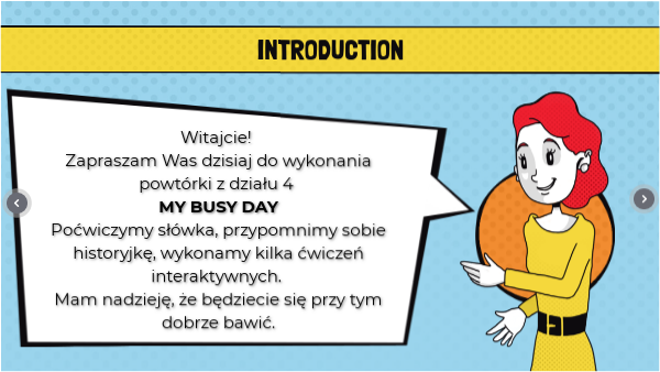 Witajcie! Zapraszam Was dzisiaj do wykonania powtórki z działu 4 MY BUSY DAY Poćwiczymy słówka, przypomnimy sobie historyjkę, wykonamy kilka ćwiczeń interaktywnych. Mam nadzieję, że będziecie się przy tym dobrze bawić.