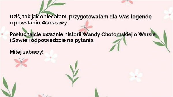 Dziś, tak jak obiecałam, przygotowałam dla Was legendę o powstaniu Warszawy. Posłuchajcie uważnie historii Wandy Chotomskiej o Warsie i Sawie i odpowiedzcie na pytania. Miłej zabawy!