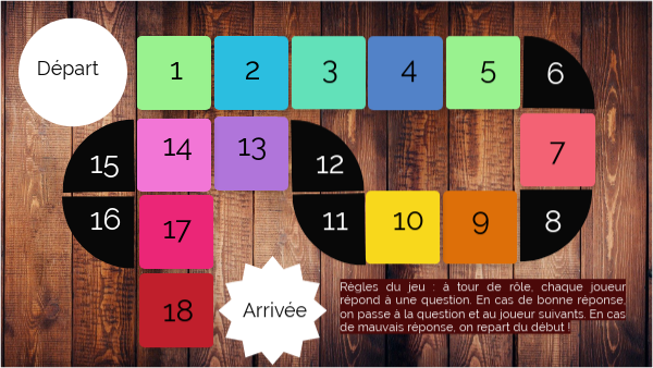Règles du jeu : à tour de rôle, chaque joueur répond à une question. En cas de bonne réponse, on passe à la question et au joueur suivants. En cas de mauvais réponse, on repart du début !