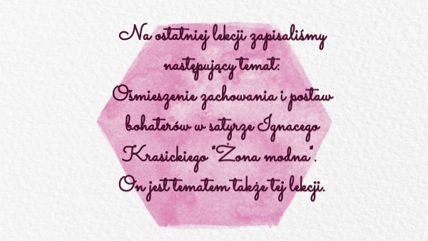 Na ostatniej lekcji zapisaliśmy następujący temat:Ośmieszenie zachowania i postaw bohaterów w satyrze Ignacego Krasickiego "Żona modna". On jest tematem także tej lekcji.