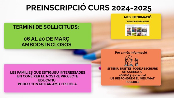 LES FAMÍLIES QUE ESTIGUEU INTERESSADES EN CONÈIXER EL NOSTRE PROJECTE EDUCATIU, PODEU CONTACTAR AMB L'ESCOLA