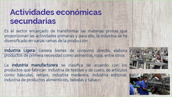 Es el sector encargado de transformar las materias primas que proporcionan las actividades primarias y para ello, la industria se ha diversificado en varias ramas de la producción. Genera bienes de consumo directo, elabora productos de primera necesidad como alimentos, ropa, entre otros. La industria manufacturera se clasifica de acuerdo con los productos que fabrican: Industria de textiles y de cuero; de artículos como básculas, relojes; industria maderera; industria editorial; industria de productos alimenticios, bebidas y tabaco.