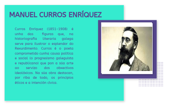 Curros Enríquez (1851-1908) é unha das figuras que, na historiografía literaria galega serve para ilustrar o esplendor do Rexurdimento. Curros é o poeta comprometido cunha causa política e social (o progresismo galeguista e republicano) que pon a súa arte ao servizo dos obxectivos ideolóxicos. Na súa obra destacan, por riba de todo, os principios éticos e a intención cívica.