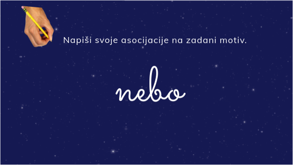1. Kako ti se svidjelo Tadijanovićevo kazivanje vlastitih stihova?2. Koja su obilježja autorskoga pjesničkog stila što ih uočavaš u ovoj pjesmi? Prepoznaj vrstu stiha i strofa, pjesnički metar, stilska izražajna sredstva, imenuj ih i citiraj. 3. Koje si tri svoje asocijacije povezao/povezala s pjesmom NEBO? 4. Koje se drage osobe pjesnik prisjeća gledajući u nebo? 5. Napiši kratku poruku osobi koja ti je draga, a koje više fizički nema među nama. Oslikaj ili digitalno ukrasi poruku motivima neba. Poruku fotografiraj i pošalji na Teams.