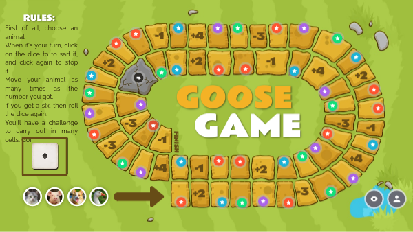 First of all, choose an animal.When it's your turn, click on the dice to to sart it, and click again to stop it. Move your animal as many times as the number you got. If you get a six, then roll the dice again. You'll have a challenge to carry out in many cells. Go!
