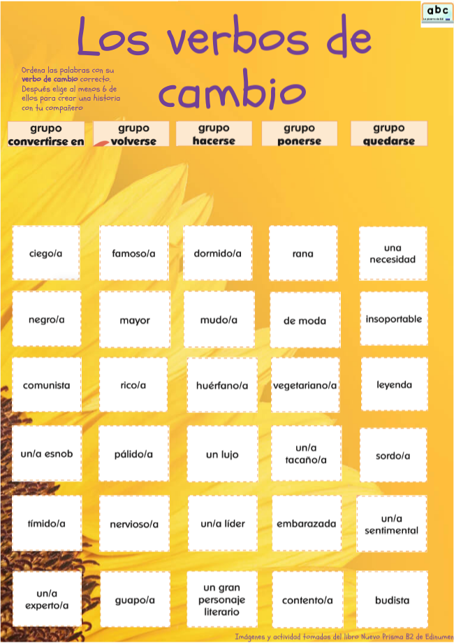 Ordena las palabras con su verbo de cambio correcto. Después elige al menos 6 de ellos para crear una historia con tu compañero