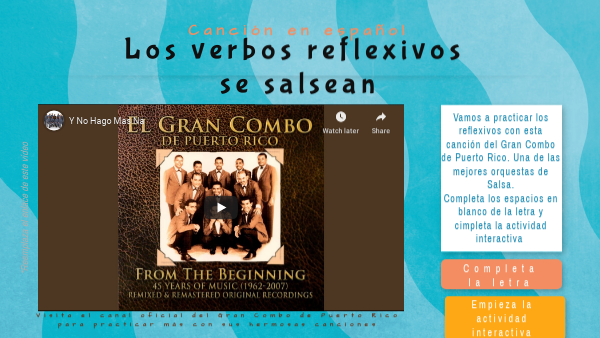 Vamos a practicar los reflexivos con esta canción del Gran Combo de Puerto Rico. Una de las mejores orquestas de Salsa. Completa los espacios en blanco de la letra y cimpleta la actividad interactiva