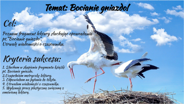 1. Słucham w skupieniu fragmentu książki pt. Bocianie gniazdo. 2.Uzupełniam metryczkę lektury.3. Odpowiadam na pytania do tekstu.4. Utrwalam wiadomości o czasowniku.5. Wykonuję pracę plastyczną związaną z omówioną lekturą.