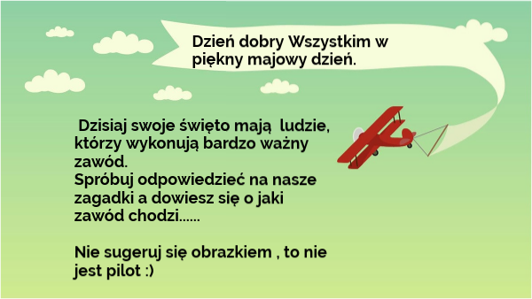 Dzisiaj swoje święto mają ludzie, którzy wykonują bardzo ważny zawód. Spróbuj odpowiedzieć na nasze zagadki a dowiesz się o jaki zawód chodzi...... Nie sugeruj się obrazkiem , to nie jest pilot :)