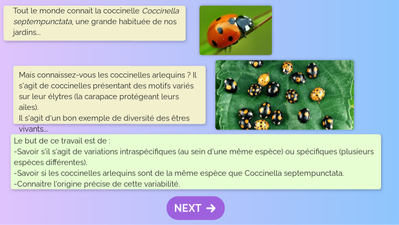 Le but de ce travail est de :-Savoir s'il s'agit de variations intraspécifiques (au sein d'une même espèce) ou spécifiques (plusieurs espèces différentes). -Savoir si les coccinelles arlequins sont de la même espèce que Coccinella septempunctata. -Connaitre l'origine précise de cette variabilité.