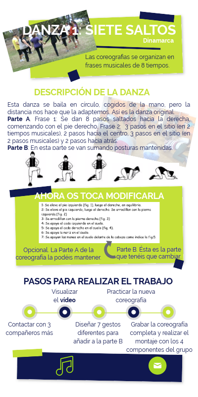 Esta danza se baila en círculo, cogidos de la mano, pero la distancia nos hace que la adaptemos. Así es la danza original.Parte A. Frase 1: Se dan 8 pasos saltados hacia la derecha, comenzando con el pie derecho. Frase 2: 3 pasos en el sitio (en 2 tiempos musicales), 2 pasos hacia el centro, 3 pasos en el sitio (en 2 pasos musicales) y 2 pasos hacia atrás: Parte B: En esta parte se van sumando posturas mantenidas.