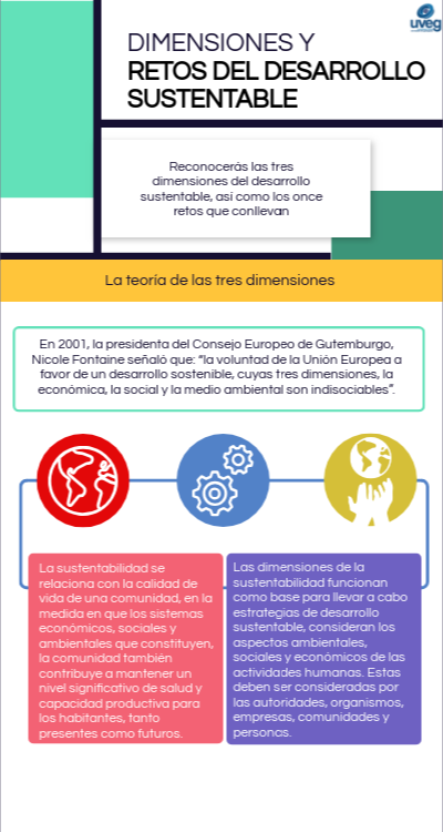 Reconocerás las tres dimensiones del desarrollo sustentable, así como los once retos que conllevan