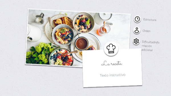 La estructura de la receta es muy organizada. Encontramos:1. Título 2. Ingredietnes o materiales necesarios y número de comensales 3. Cuerpo de la receta 4. Consejos