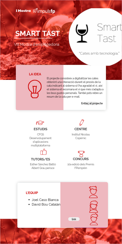 El projecte consisteix a digitalitzar les cates obtenint una interacció durant el procés de la cata indicant al sistema si t'ha agradat el vi, així el sistema et recomana el vi que més s'adapta a les teus gustos personals. També pots rebre un resum de la cata per e-mail.