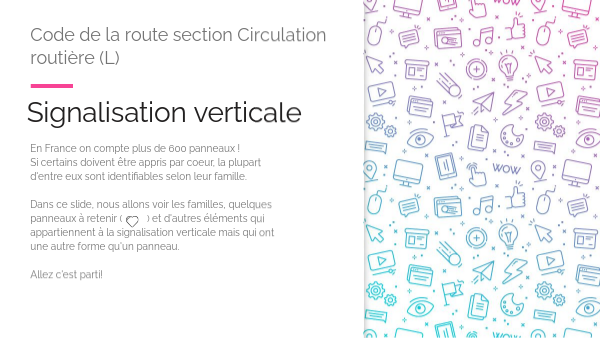 En France on compte plus de 600 panneaux ! Si certains doivent être appris par coeur, la plupart d'entre eux sont identifiables selon leur famille. Dans ce slide, nous allons voir les familles, quelques panneaux à retenir ( ) et d'autres éléments qui appartiennent à la signalisation verticale mais qui ont une autre forme qu'un panneau. Allez c'est parti!