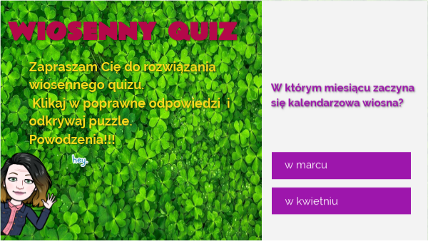 Zapraszam Cię do rozwiązania wiosennego quizu. Klikaj w poprawne odpowiedzi i odkrywaj puzzle. Powodzenia!!!