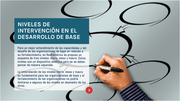 Para un mejor entendimiento de las capacidades y del desafio de las organizaciones de base en relación a su fortalecimiento, en RedEAmérica se propuso un esquema de tres niveles: micro, meso y macro. Estos niveles son un dispositivo analítico pero no se deben pensar de manera separada. La interrelación de los niveles micro, meso y macro es fundamental para las organizaciones de base y el fortalecimiento de las organizaciones no podría limitarse a algunos de los niveles en desmedro de los otros.