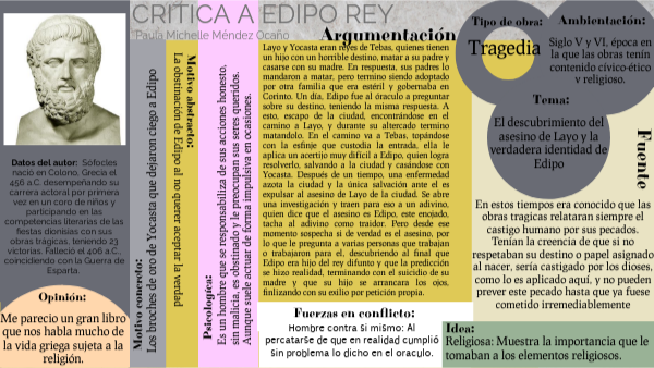 Datos del autor: Sófocles nació en Colono, Grecia el 456 a.C. desempeñando su carrera actoral por primera vez en un coro de niños y participando en las competencias literarias de las fiestas dionisias con sus obras trágicas, teniendo 23 victorias. Falleció el 406 a.C., coincidiendo con la Guerra de Esparta.