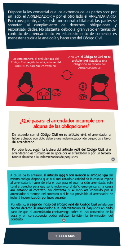 Dispone la ley comercial que los extremos de las partes son: por un lado, el ARRENDADOR y por el otro lado el ARRENDATARIO. Por consiguiente, al ser este un contrato bilateral, las partes se someten al cumplimiento de derechos, obligaciones y responsabilidades. No obstante, debido al gran vacío en temas del contrato de arrendamiento en establecimiento de comercio, es menester acudir a la analogía y hacer uso del Código Civil.