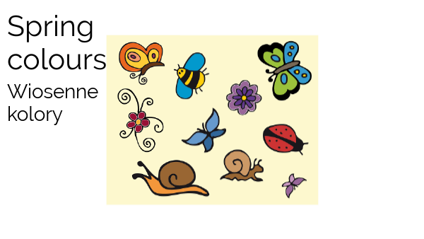 Z pomocą rodzica narysuj i wytnij kształt motyla lub kwiatka. Pomóż motylkowi/kwiatuszkowi odszukać kolory z piosenek (przykładaj do rzeczy w domu).