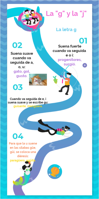 Se escriben con g:• Las palabras que empiezan por geo-, gen- y gest-: geografía, genético, gesto.• Los verbos terminados en -ger, -gir y -gerar, excepto tejer y crujir: proteger, surgir, refrigerar.• Las palabras que terminan en -gen: origen.