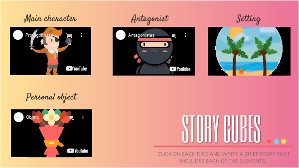 CLICK ON EACH DICE AND WRITE A BRIEF story THAT INCLUDES EACH OF THE ELEMENTS .