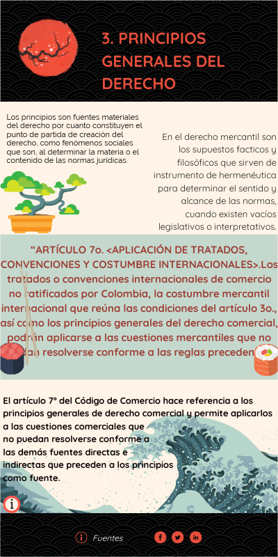 El artículo 7º del Código de Comercio hace referencia a los principios generales de derecho comercial y permite aplicarlos a las cuestiones comerciales que no puedan resolverse conforme a las demás fuentes directas e indirectas que preceden a los principios como fuente.