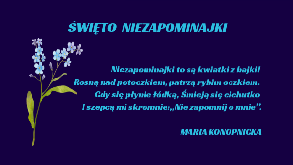 Niezapominajki to są kwiatki z bajki! Rosną nad potoczkiem, patrzą rybim oczkiem. Gdy się płynie łódką, Śmieją się cichutko I szepcą mi skromnie:„Nie zapomnij o mnie”. MARIA KONOPNICKA
