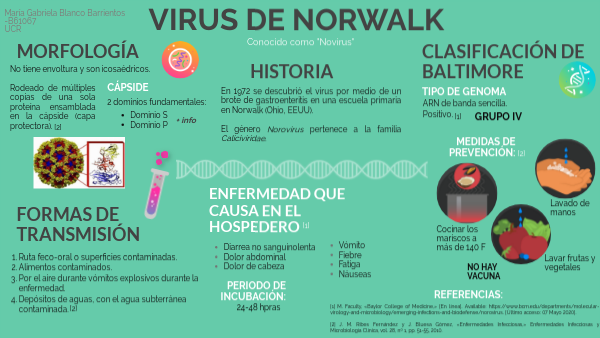 [1] M. Faculty, «Baylor College of Medicine,» [En línea]. Available: https://www.bcm.edu/departments/molecular-virology-and-microbiology/emerging-infections-and-biodefense/norovirus. [Último acceso: 07 Mayo 2020].[2] J. M. Ribes Fernández y J. Bluesa Gómez, «Enfermedades Infecciosas,» Enfermedades Infecciosas y Microbiología Clínica, vol. 28, nº 1, pp. 51-55, 2010.