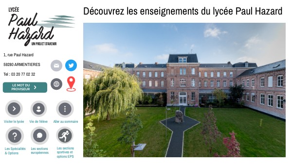 BIENVENUE AU LYCEE PAUL HAZARD ! Lors de votre visite, vous allez découvrir notre offre éducative et rencontrer une équipe pédagogique professionnelle qui place l’élève au centre de ses préoccupations. En effet, les années lycées constituent un passage vers l’âge adulte et vers l’enseignement supérieur.C’est dans cet objectif, que nous mettons tout en œuvre afin d’accompagner l’ensemble de nos élèves de la seconde au BTS dans leur parcours et leur projet de vie.Les diverses options et spécialités nous permettent d’offrir à chaque élève un parcours de réussite et enrichissent leur expérience scolaire.Le lycée Paul Hazard est un lieu de travail et d’avenir où nous veillons à faciliter l’intégration de nos élèves issus des collèges en maintenant un climat de respect, de confiance, d’écoute dans le respect des valeurs qui nous unissent.Merci pour votre confiance.