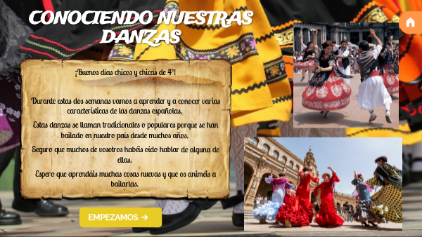 ¡Buenos días chicos y chicas de 4º! Durante estas dos semanas vamos a aprender y a conocer varias características de las danzas españolas. Estas danzas se llaman tradicionales o populares porque se han bailado en nuestro país desde muchos años. Seguro que muchos de vosotros habéis oído hablar de alguna de ellas. Espero que aprendáis muchas cosas nuevas y que os animéis a bailarlas.