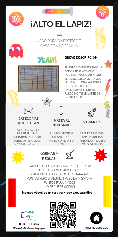 EL JUEGO CONSISTE EN QUE TODOS TENEMOS QUE ESCRIBIR UNA PALABRA QUE EMPIEZE POR LA LETRA QUE SE DIGA DE UNA CATEGORIA QUE SE ESTABLECE ANTERIORMENTE. ESTE JUEGO NO TIENE LIMITE DE PARTICIPANTES