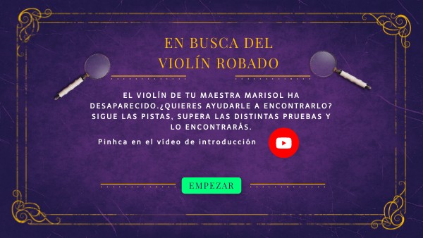 EL VIOLÍN DE TU MAESTRA MARISOL HA DESAPARECIDO.¿QUIERES AYUDARlE A ENCONTRARLO?SIGUE LAS PISTAS, SUPERA LAS DISTINTAS PRUEBAS Y LO ENCONTRARÁS.