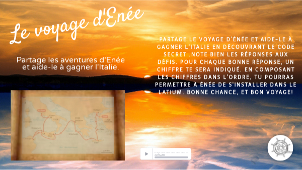 Partage le voyage d’Énée et aide-le à gagner l'Italie en découvrant le code secret .Note bien les réponses aux défis. Pour chaque bonne réponse, un chiffre te sera indiqué. En composant les chiffres dans l'ordre, tu pourras permettre à Énée de s'installer dans le Latium. Bonne chance, et bon voyage!