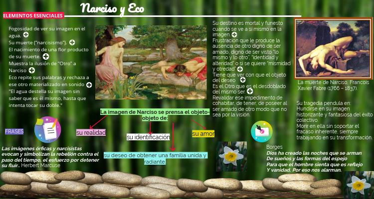 Su destino es mortal y funesto cuando se ve a sí mismo en la imagen. Frustración que le produce la ausencia de otro digno de ser amado, digno de ser visto “lo mismo y lo otro”, “identidad y alteridad” o si se quiere “mismidad y otredad” Tiene que ver con que el objeto del deseo Es el Otro que es el desdoblado del mismo ser. Revalidar ese impedimento de cohabitar, de tener, de poseer al ser amado de otro modo que no sea por la visión.