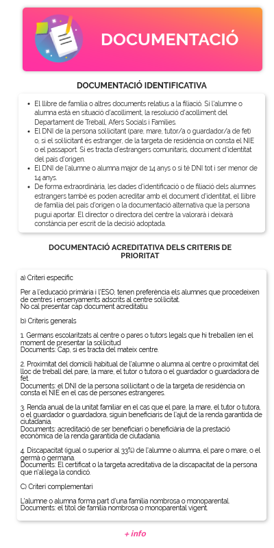 a) Criteri específic Per a l'educació primària i l'ESO, tenen preferència els alumnes que procedeixen de centres i ensenyaments adscrits al centre sol·licitat. No cal presentar cap document acreditatiu. b) Criteris generals 1. Germans escolaritzats al centre o pares o tutors legals que hi treballen (en el moment de presentar la sol·licitud Documents: Cap, si es tracta del mateix centre. 2. Proximitat del domicili habitual de l'alumne o alumna al centre o proximitat del lloc de treball del pare, la mare, el tutor o tutora o el guardador o guardadora de fet. Documents: el DNI de la persona sol·licitant o de la targeta de residència on consta el NIE en el cas de persones estrangeres. 3. Renda anual de la unitat familiar en el cas que el pare, la mare, el tutor o tutora, o el guardador o guardadora, siguin beneficiaris de l'ajut de la renda garantida de ciutadania. Documents: acreditació de ser beneficiari o beneficiària de la prestació econòmica de la renda garantida de ciutadania. 4. Discapacitat (igual o superior al 33%) de l'alumne o alumna, el pare o mare, o el germà o germana. Documents: El certificat o la targeta acreditativa de la discapacitat de la persona que n'al·lega la condicó. C) Criteri complementari L'alumne o alumna forma part d'una família nombrosa o monoparental. Documents: el títol de família nombrosa o monoparental vigent.