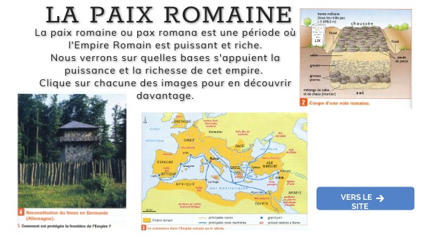 La paix romaine ou pax romana est une période où l'Empire Romain est puissant et riche.Nous verrons sur quelles bases s'appuient la puissance et la richesse de cet empire. Clique sur chacune des images pour en découvrir davantage.