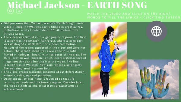 - Did you know that Michael Jackson’s “Earth Song,” music video, filmed in 1995, was partly filmed in Croatia? Yes, in Karlovac, a city located about 80 kilometers from Plitvice Lakes.
