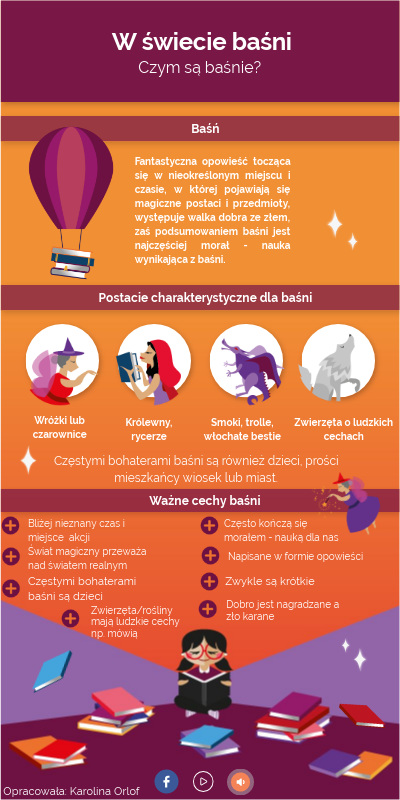 Fantastyczna opowieść tocząca się w nieokreślonym miejscu i czasie, w której pojawiają się magiczne postaci i przedmioty, występuje walka dobra ze złem, zaś podsumowaniem baśni jest najczęściej morał - nauka wynikająca z baśni.