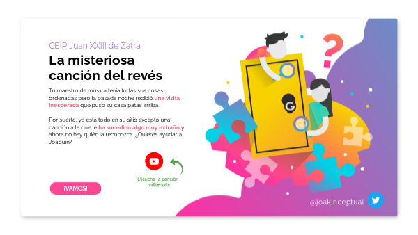 Tu maestro de música tenía todas sus cosas ordenadas pero la pasada noche recibió una visita inesperada que puso su casa patas arriba. Por suerte, ya está todo en su sitio excepto una canción a la que le ha sucedido algo muy extraño y ahora no hay quién la reconozca. ¿Quieres ayudar a Joaquín?