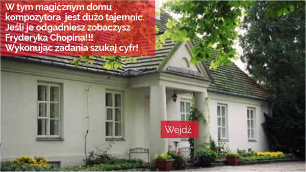 W tym magicznym domu kompozytora jest dużo tajemnic. Jeśli je odgadniesz zobaczysz Fryderyka Chopina!!! Wykonując zadania szukaj cyfr!