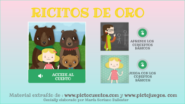 Para elaborar este Genially he utilizado imágenes y material de las páginas "www.pictocuentos.com" y www. "pictojuegos.com". La finalidad es trabajar el cuento de "Ricitos de oro" y a través de él, los conceptos básicos.
