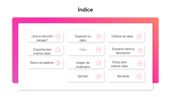 2. Después, describimos lo particular: ir localizando en ese lugar los distintos elementos(la montaña, el río, los árboles,...) utilizando palabras que indican su situación en el espacio. Para ello, se usarán palabras que se llaman conectores espaciales como: a la derecha, junto a, al fondo, detrás de, en el centro, alrededor, en lo más profundo, en primer plano, en la parte superior, al norte, a lo lejos,...