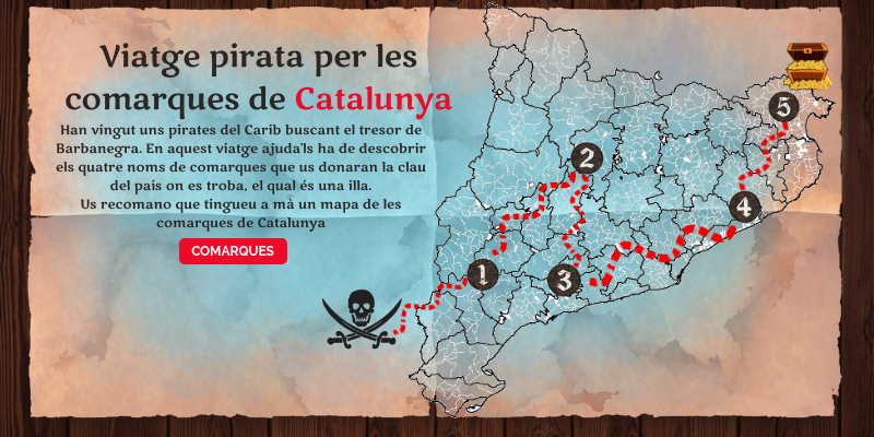 Han vingut uns pirates del Carib buscant el tresor de Barbanegra. En aquest viatge ajuda'ls ha de descobrir els quatre noms de comarques que us donaran la clau del país on es troba, el qual és una illa.Us recomano que tingueu a mà un mapa de les comarques de Catalunya